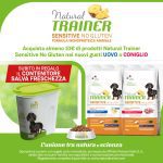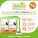 Il coniglio, uno degli alimenti di punta di Natural Trainer, invece è andato incontro ad un restyling di packaging e formula: da Natural Trainer Sensitive Plus è passato a Natural Trainer Sensitive No Gluten (con conseguente cambio di colore del pacchetto). Naturalmente è cambiata anche la formulazione che adesso vede i cereali integrali all’interno della ricetta.