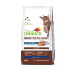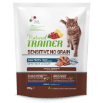 Senza cereali. Una sola proteina animale. Gusto trota. Natural Trainer lancia sul mercato un nuovo prodotto, il Sensitive No Grain. Disponibile nei due classici formati, 300g e 1,5kg, il nuovo alimento alla trota va a completare la già ampia gamma di prodotti secchi per il gatto.